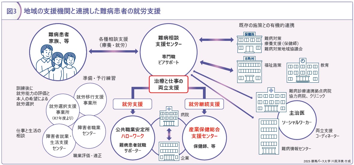 地域においては、難病相談支援センターが中心となり、各支援機関、難病患者・家族、主治医との間に立って、連携体制の構築と調整を担っている(図3)。治療と仕事の両立支援は、難病相談支援センターの最も重要な事業の一つである。たとえば、 患者が安心して働き続けることができるよう、職場に対して提出する意見書の作成を主治医に依頼することもある。