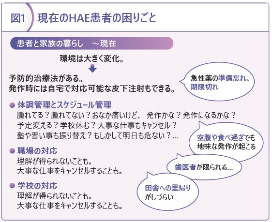 近年HAEの治療環境は大きく進歩しており、それとともに患者が抱える悩みや問題も変化がみられるようになった(図1)。たとえば、体調管理やスケジュール管理の面では、「空腹や食べ過ぎでも発作が起きる」、「受診できる歯医者が限られる」、「頼れる病院がない田舎に里帰りしづらい」、「発作かどうかの見極めが難しいので予定変更の判断に悩む」などの声が寄せられている。また、「職場や学校で理解が得られない」、「対応してくれない」という相談も多い。すなわち、患者が日頃直面している困難は、病気そのものというよりも、「それに対応することの難しさ」であると言える。