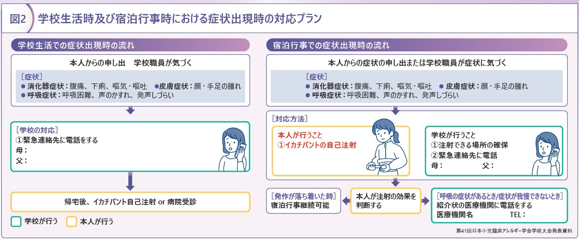 Webカンファレンスでは、まず自己注射を行う際の場所の確保と、プライバシーへの配慮を依頼した。これは、清潔な操作が必要なことに加えて、他の生徒にみられることへの抵抗感を軽減する意味もある。さらに本人から申告があった際には、早めの注射使用をお願いした。また、学校生活時および宿泊行事時などでの対応については、流れを可視化できるように、フローチャートの形で示した(図2)。カンファレンスに出席した学校職員からは、「発作時の対応について何をすればよいかがわかった」「医療者の顔が見れて、病院の敷居が少し下がった。今後も連絡を取れることを希望する」「プライバシーへの配慮を考えるきっかけとなった」などの感想があった。