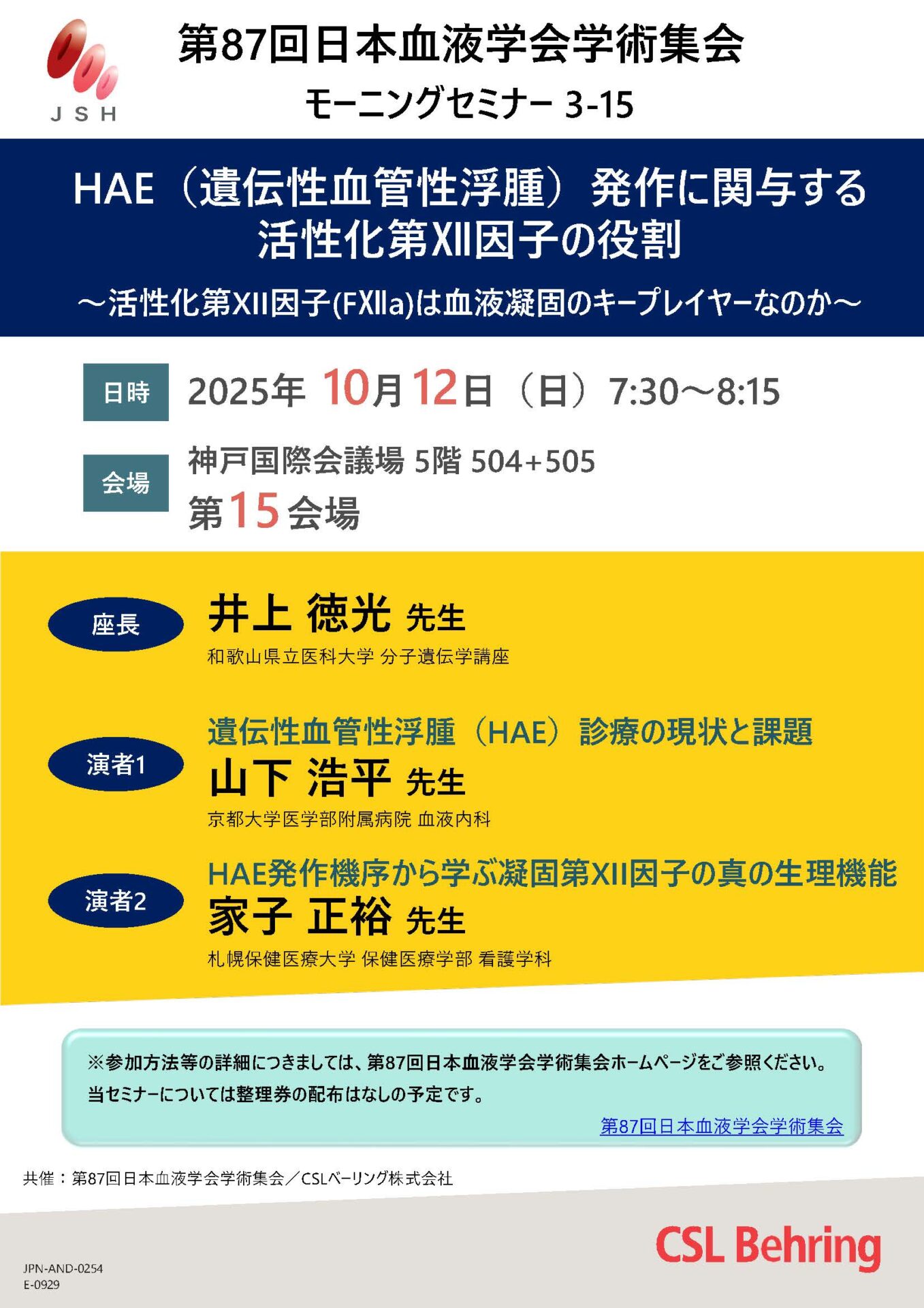 第87回日本血液学会学術集会モーニングセミナー 3-15において「HAE(遺伝性血管性浮腫)発作に関与する