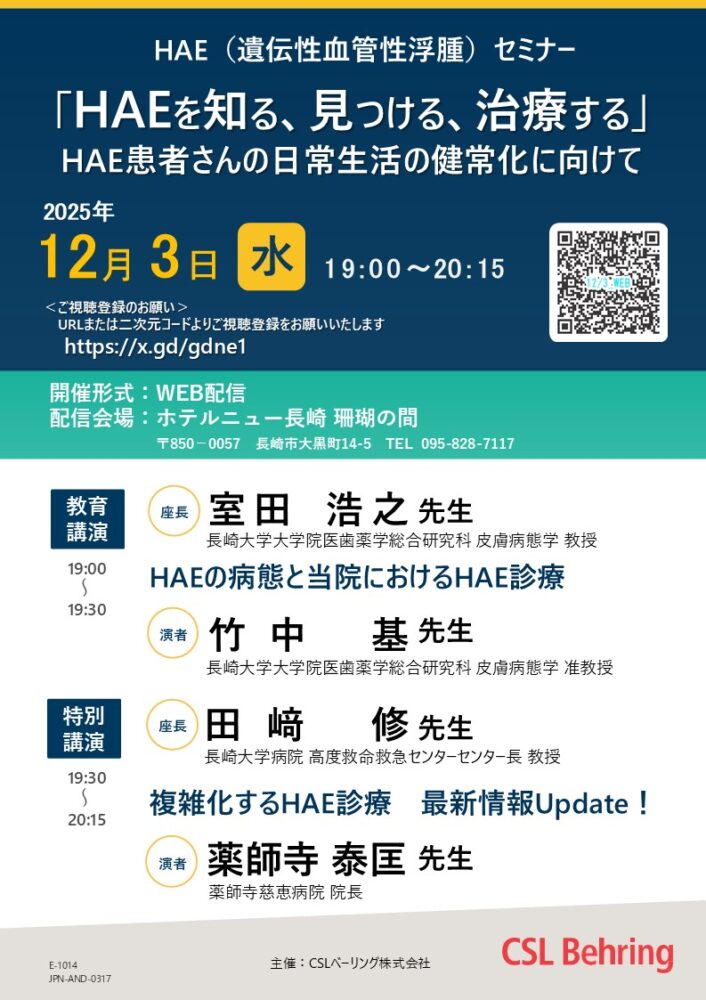 「「HAEを知る、見つける、治療する」HAE患者さんの日常生活の健常化に向けて」をテーマに、Webセミナーを開催いたします。Web視聴には事前登録が必要となります。