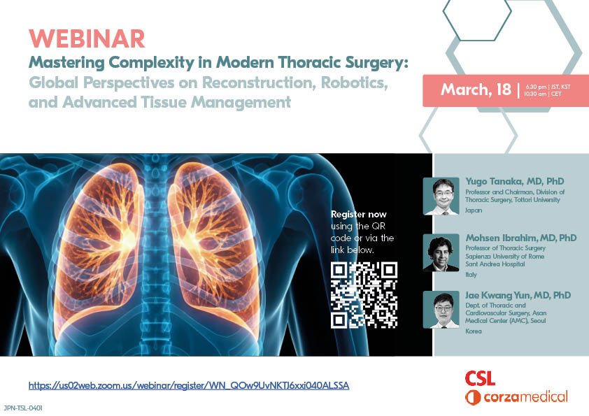 免疫療法後の手術や高度再建など、現代の呼吸器外科が直面する「複雑かつ困難な症例」。本企画では、ロボット手術をはじめとする先端技術と、それらを支える確実な組織管理・エアリーク制御のテクニックに焦点を当てます。日・欧・韓それぞれの第一線で活躍するエキスパートが、国境を越えた知見と明日から使えるTips & Tricksを共有します。